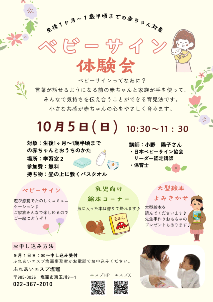 2025年08月20日 ふれあいエスプ塩竈 【定員になりました】ベビーサイン体験会 0歳から楽しめる! ~赤ちゃんとお手てでお話~家族の時間をもっと特別にしよう…💛 9月1日より申込受付開始いたします。 先着6組(おうちの方やきょうだいの方もご一緒にどうぞご参加ください) お問い合わせ ふれあいエスプ塩竈 TEL:022-367-2010