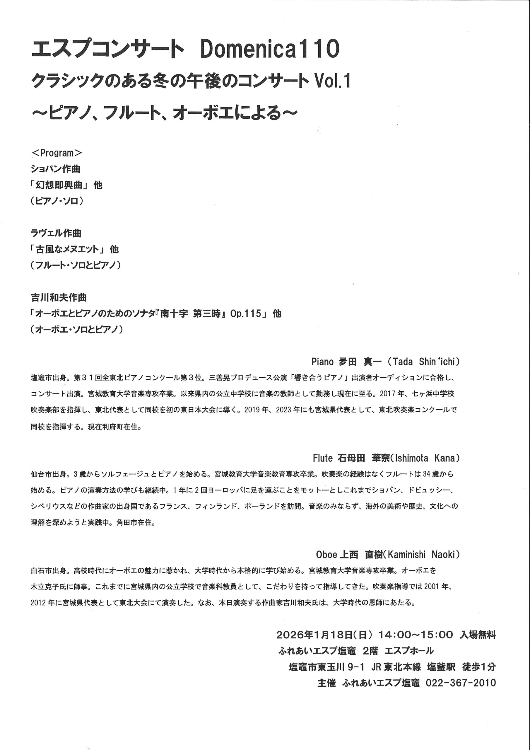 エスプコンサートDomenica110 「クラシックのある冬の午後のコンサートVol.1 ~ピアノ、フルート、オーボエによる~」