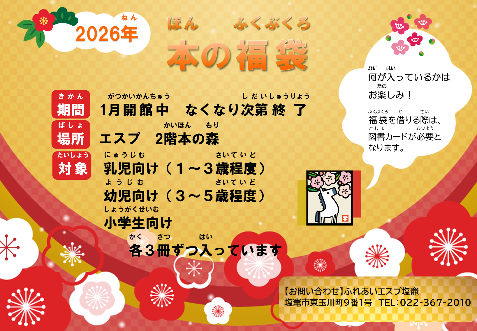 2026年01月11日 ふれあいエスプ塩竈 2026年 本の福袋 2026年本の福袋を本の森で開催中!貸出の袋の中にスタッフが選んだおすすめ本が3冊入っています。乳児・幼児・小学生と年齢別に用意しております。中身はお楽しみ♪ぜひご利用ください! とき:一月開館時間中 なくなり次第終了 場所:エスプ2階 本の森 ★本を借りるときは、利用カードをご準備ください。 ★福袋の本を含めて15冊までの貸出になります。
