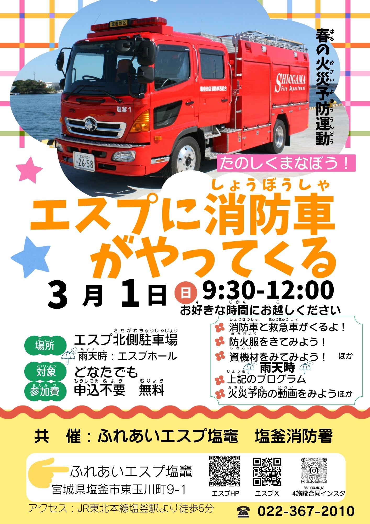 2026年02月02日 ふれあいエスプ塩竈 エスプに消防車がやってくる! 春の火災予防運動 消防車がエスプにやってきます!消防署員さんたちと一緒に火災予防、救急について学びましょう! 会 場:晴天時:エスプ北側駐車場 雨天時:エスプホール 時 間:9:30~12:00 対 象:どなたでも 参加費:無料 申 込:不要 お問い合わせ ふれあいエスプ塩竈 TEL:022–367-2010