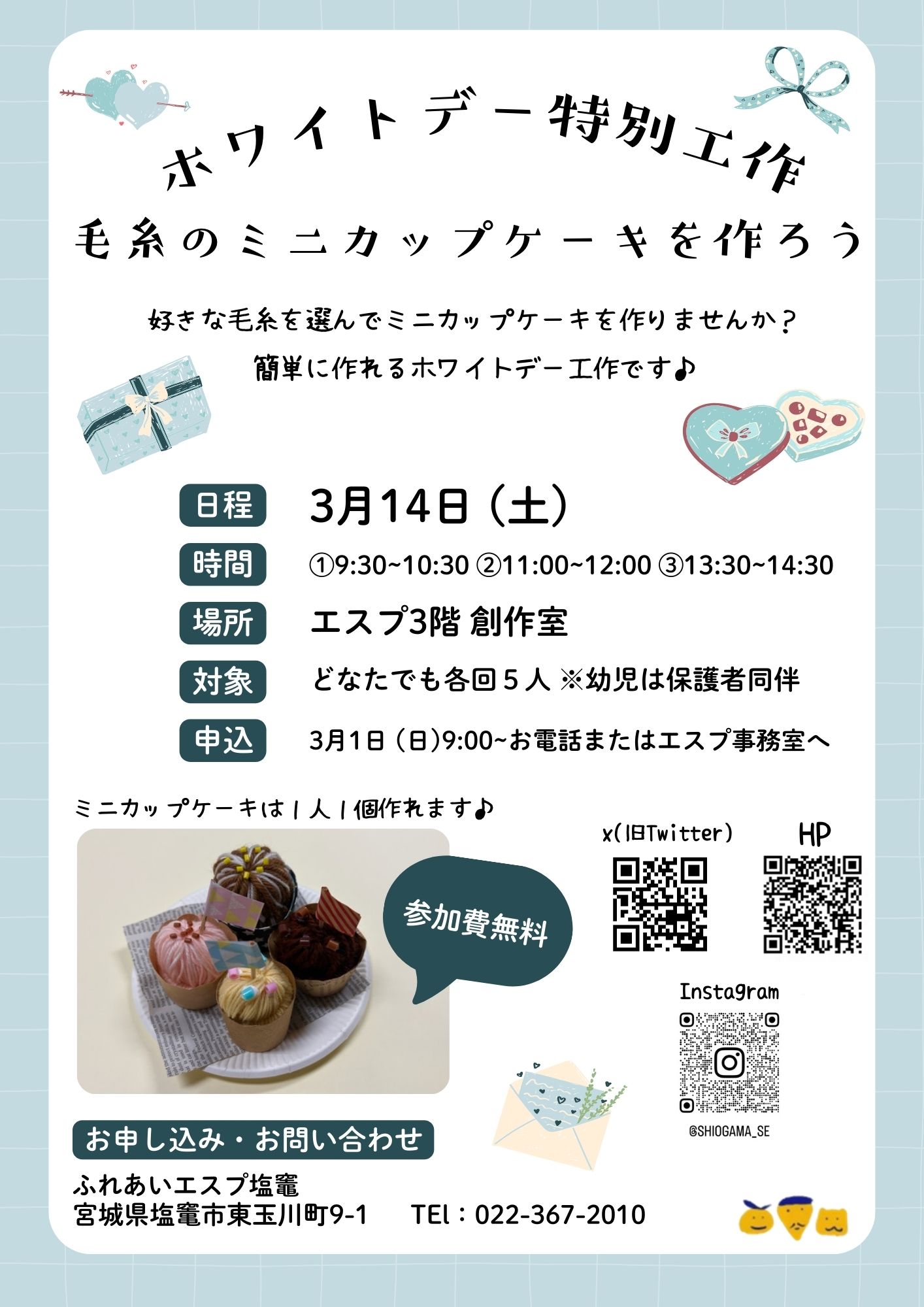 2026年02月19日 ふれあいエスプ塩竈 ホワイトデー特別工作「毛糸のミニカップケーキを作ろう」 ホワイトデー特別工作「毛糸のミニカップケーキを作ろう」を開催🧁 ホワイトデーにぴったり!毛糸を使って可愛いカップケーキ工作をしませんか? と き:3月14日(土) 時 間:①9:30~②11:00~③13:30~ 対 象:どなたでも各回5人 ところ:エスプ3階 創作室 申 込:3月1日(日)9:00~エスプ事務室またはお電話 【お問い合わせ】 ふれあいエスプ塩竈 TEL:022-367-2010
