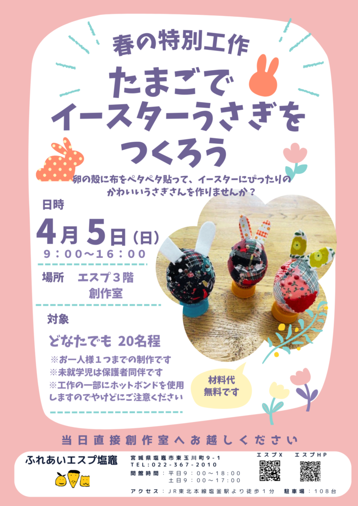 2026年03月18日 ふれあいエスプ塩竈 春の特別工作「たまごでイースターうさぎをつくろう」 今年のイースターは4月5日(日)です🥚 本物のたまごの殻を使って可愛いイースターうさぎを作りませんか🐰? と き:4月5日(日) 時 間:9:30~16:00 対 象:どなたでも20名程 ところ:エスプ3階 創作室 申 込:申込不要。当日直接創作室へお越しください。 【お問い合わせ】 ふれあいエスプ塩竈 TEL:022-367-2010