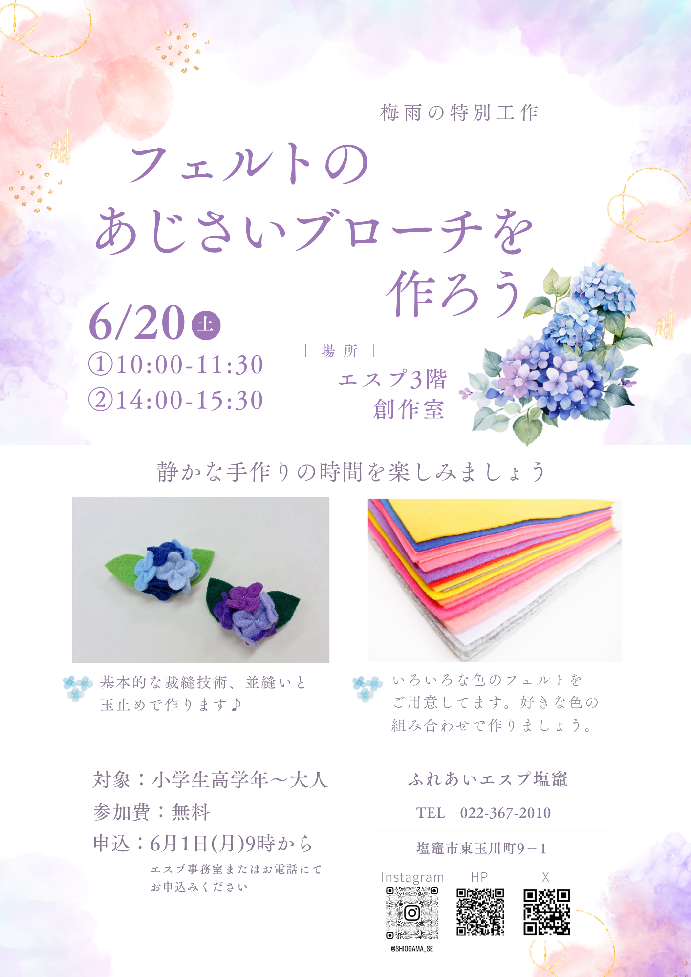 2026年04月26日 ふれあいエスプ塩竈 梅雨の特別工作「フェルトのあじさいブローチを作ろう」 やさしい色合いのフェルトを重ねて、ふんわり可愛いあじさいに… 手仕事の時間で、ほっとリフレッシュしませんか? 🧵高学年~大人向け 初めての方もお気軽にご参加ください◎ 対 象:小学生高学年~大人 各回4人 材料費:無料 申 込:6月1日(月)9:00~エスプ事務室又はお電話 【お問い合わせ】ふれあいエスプ塩竈 TEL:022-367-2010