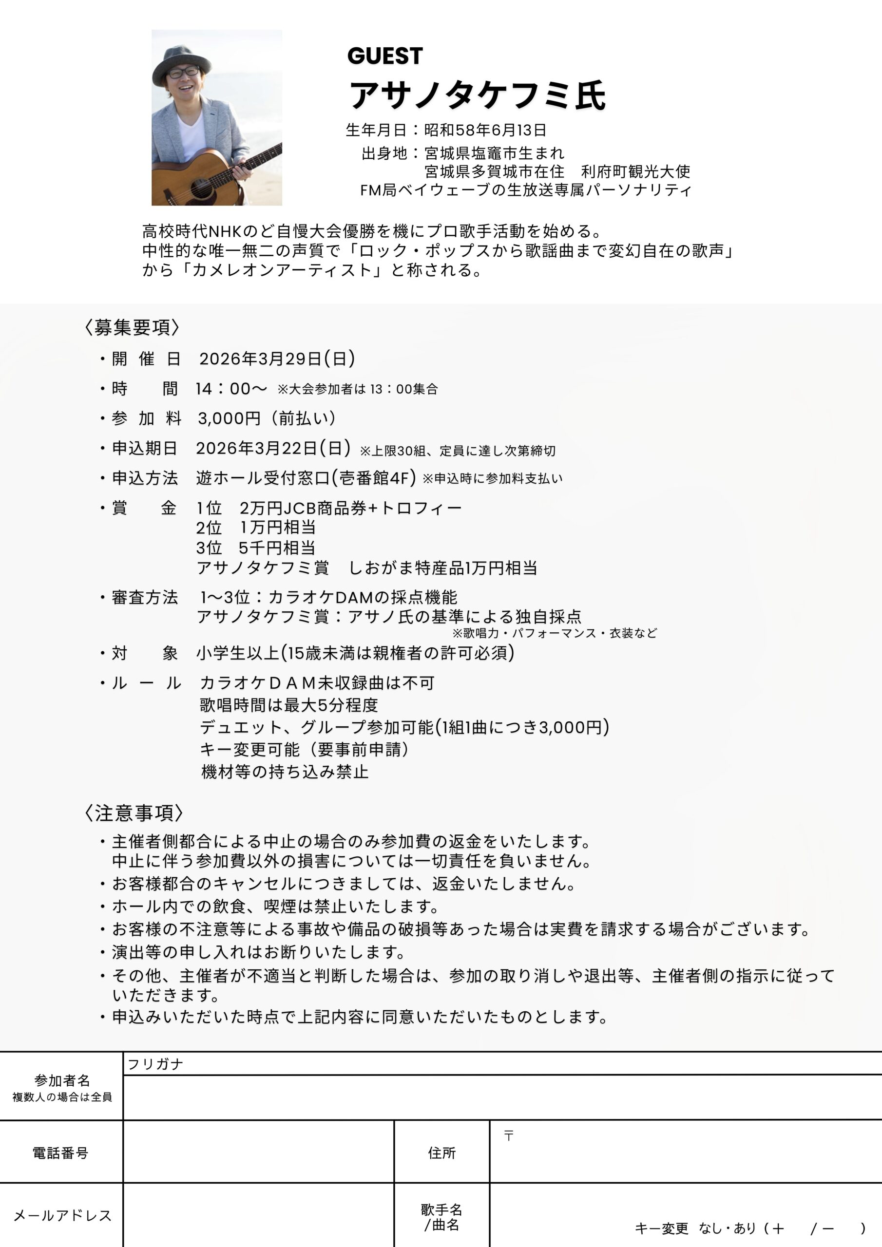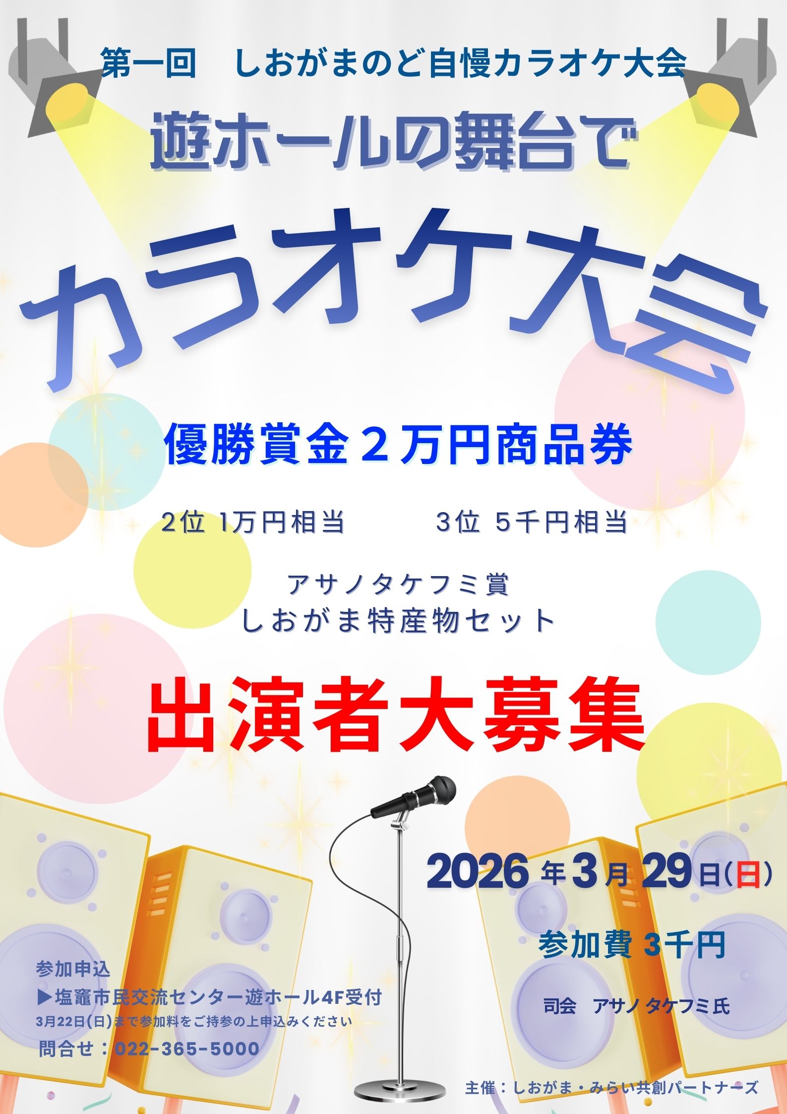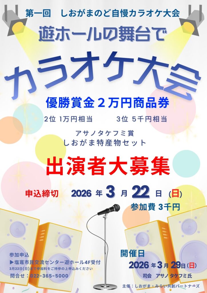 優勝者には商品券2万円を贈呈!司会は塩竈のFM局BAYWAVE専属パーソナリティ、アサノタケフミさんが務めます。