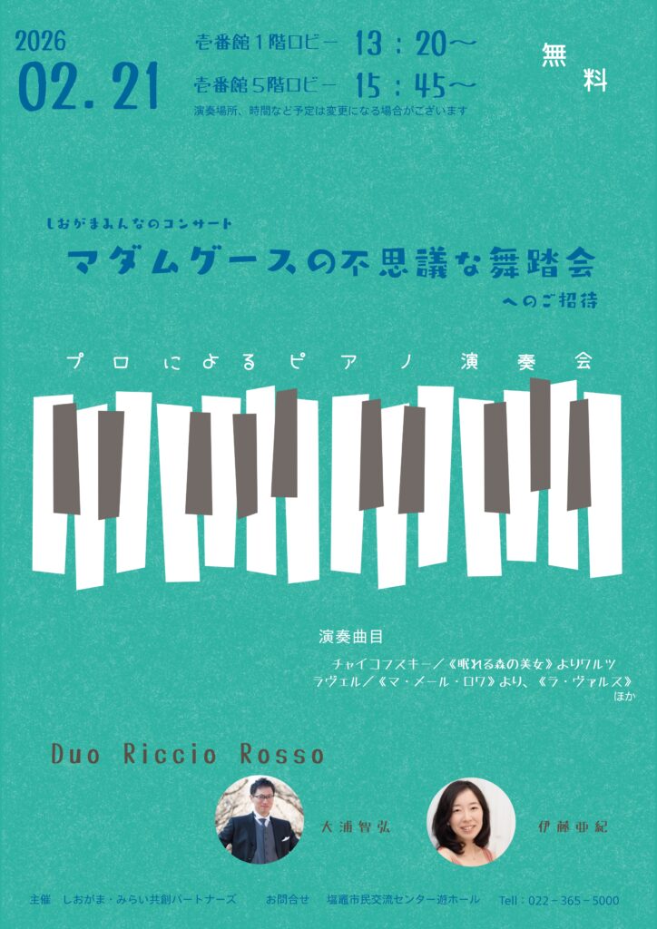 2026年01月05日 遊ホール 【2月21日(土)】無料!「プロによるピアノ演奏会」 2月21日(土)チャレンジホールと同日にロビーコンサートも開催予定! チャレンジホールの開演前と終演後にそれぞれ1Fロビーと5F交流広場にて プロの音楽家による無料ピアノ演奏会を行います。 3月22(日)に公演予定の 「しおがま・みんなのコンサートVOL.6 マダム・グースの不思議な舞踏会」 に出演予定のお二人による演奏をお楽しみください!! (演奏者:大浦智弘、伊藤亜紀) ※予定は変更になる場合がございます。