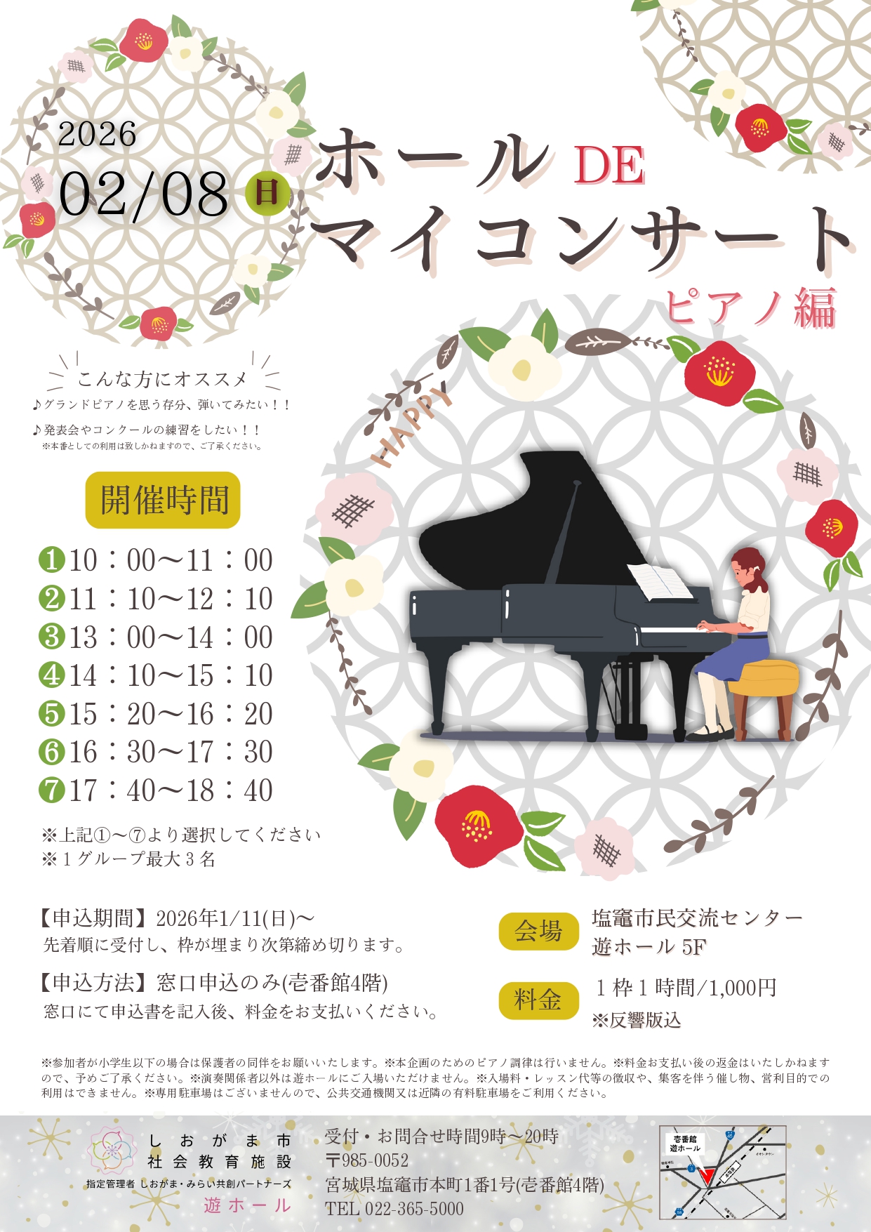 お問合わせ先【塩竈市民交流センター・遊ホール  TEL  022-365-5000/受付時間  9時~20時】