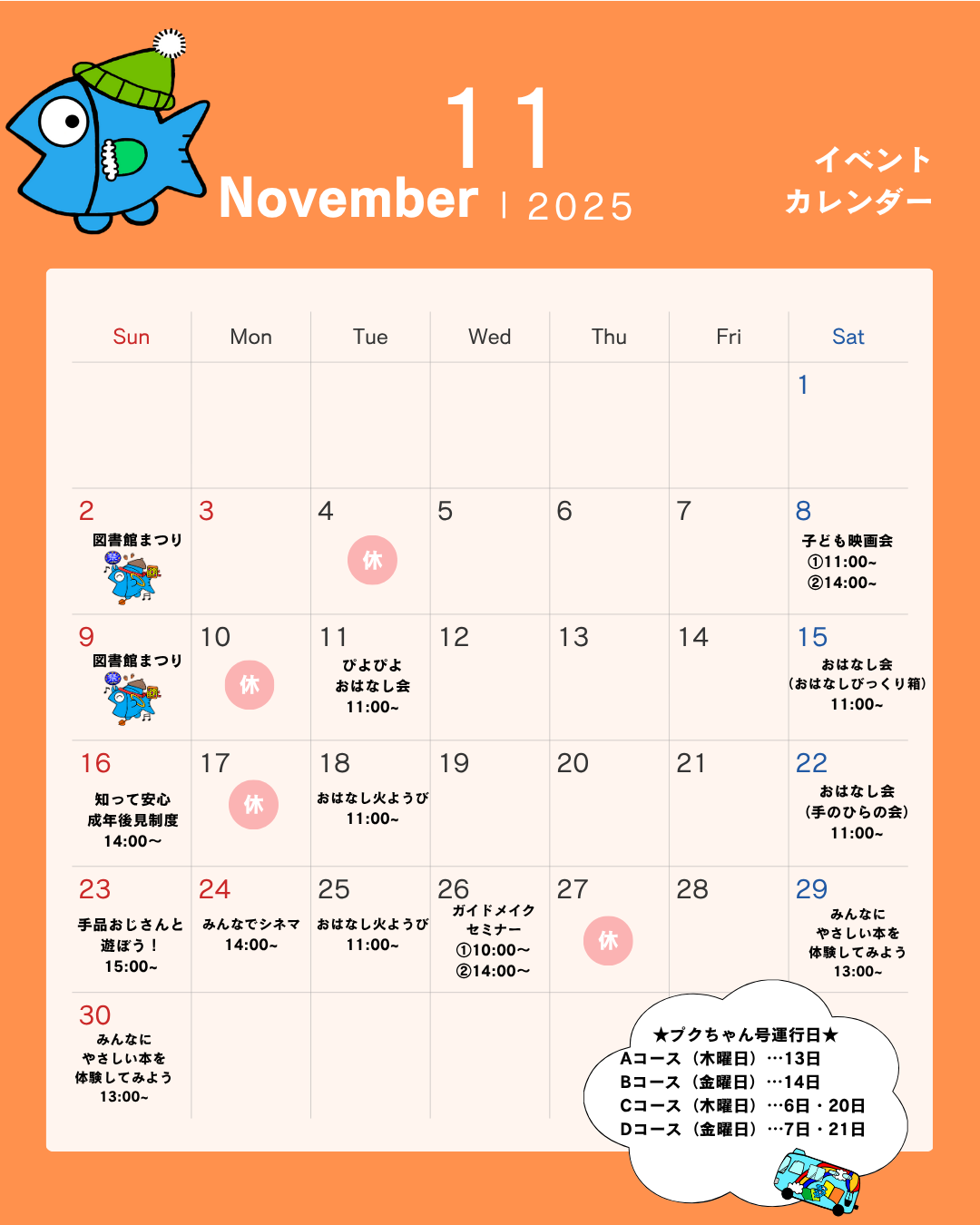 市民図書館11月の図書館イベントカレンダーです!