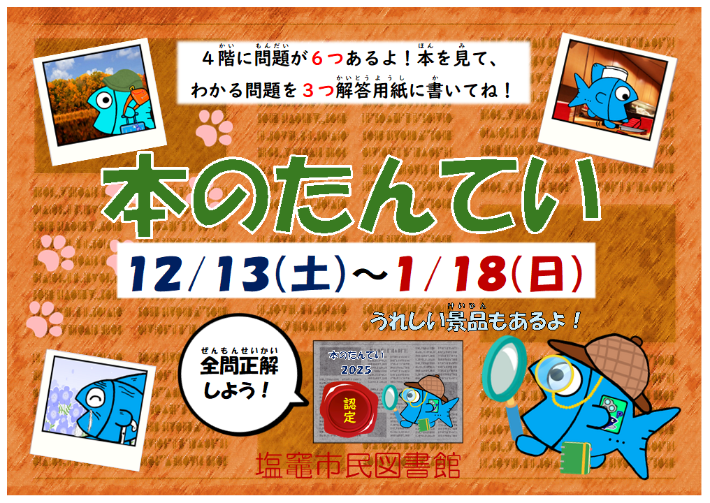 2025年12月12日 市民図書館 【本のたんてい🔍スタート!】 今年の冬も【本のたんてい】がはじまります! 図書館4階児童書フロアにある問題の中から3問見つけて答えてね。 全問正解するとオリジナルシールがもらえるよ♪ 図書館にきたらチャレンジしてみてね!! 期間:12/13(土)~1/18(日) 場所:図書館4階 対象:小学生まで