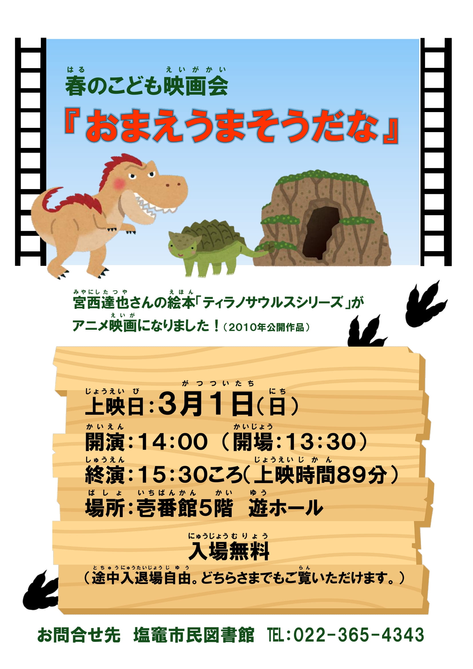 2026年01月30日 市民図書館 春のこども映画会 2026年3月1日(日) 上映作品 『おまえうまそうだな』 開場 13時30分 開演 14時00分 終演予定 15時30分(上映時間89分) 場所 壱番館5階 游ホール 入場無料 途中入退場自由 年齢制限なし