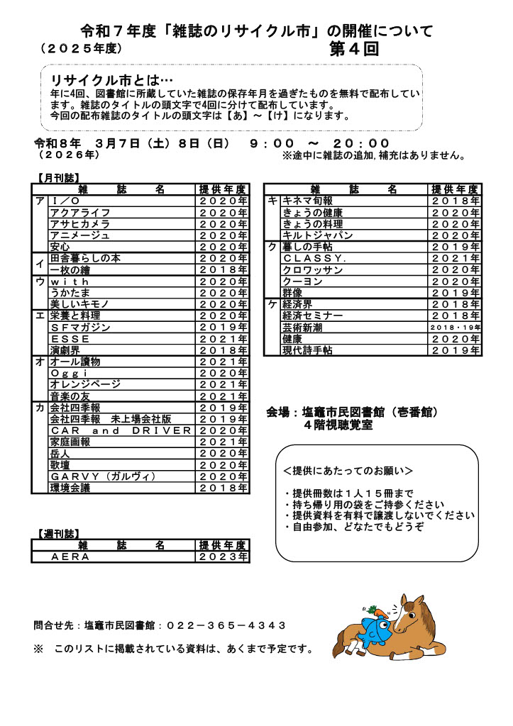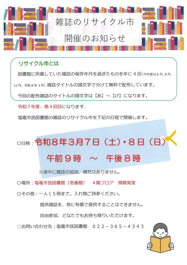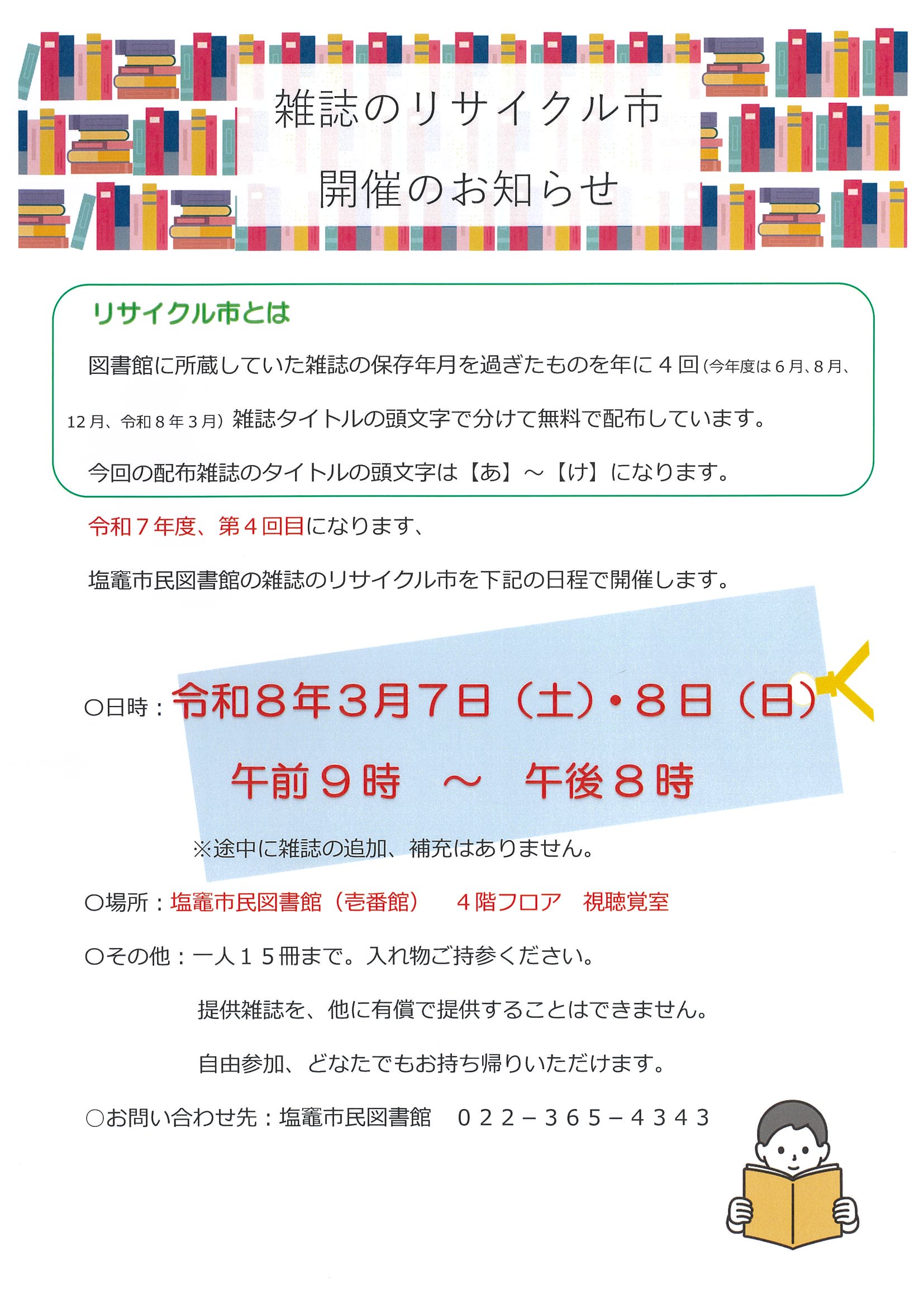 2026年01月30日 市民図書館 【3/7・8】令和7年度 第4回リサイクル市 塩竈市民図書館が所蔵する資料で、保存年数を過ぎた雑誌を皆様へ無償で提供いたします。 ・提供冊数は1人15冊まで ・持ち帰り用の袋をご持参ください ・提供資料を有料で譲渡しないでください 当日は、壱番館4階視聴覚室へお越しください。 詳しくは、下記画像をご確認ください。 お問い合わせ 塩竈市民図書館 (TEL)022-365-4343