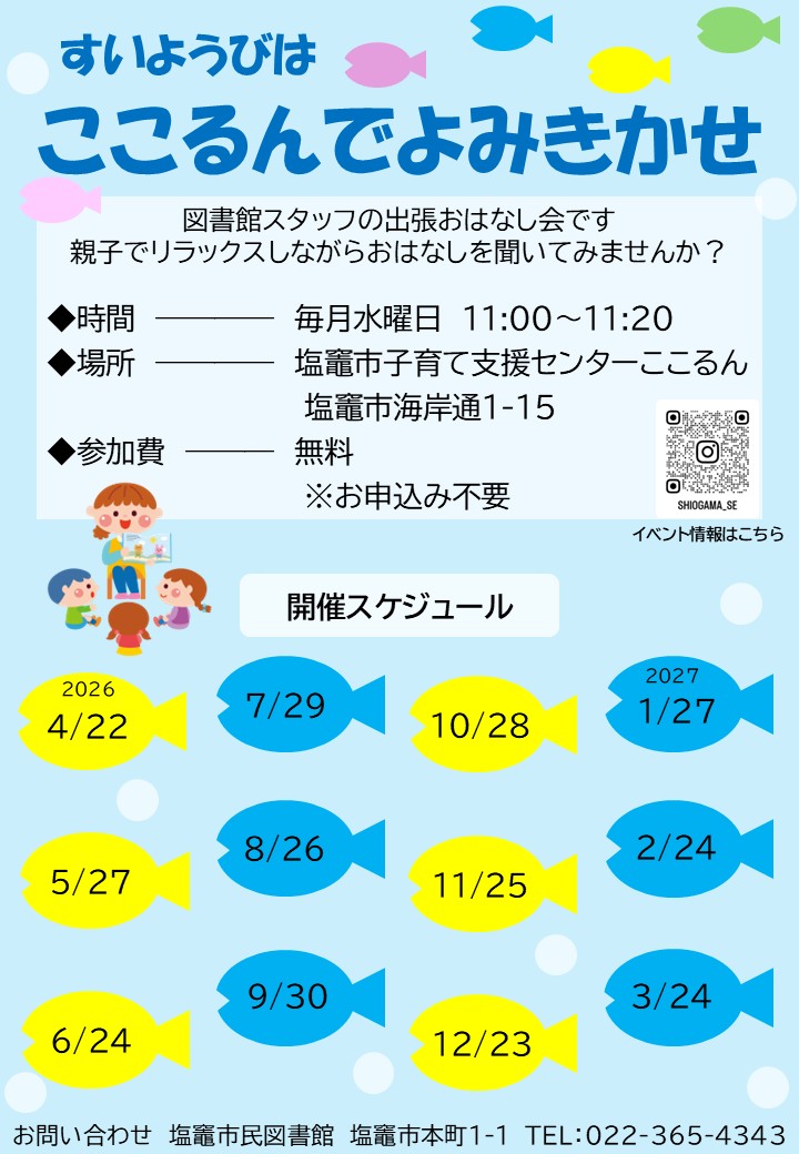 2026年04月12日 市民図書館 ここるんでよみきかせ すいようびはここるんでよみきかせ🐟 支援センターここるんで図書館スタッフが絵本のよみきかせを行います。 好きなことをしながら、動きながら、心地よく聞いていただけたらうれしいです。 年間スケジュールはポスターをご覧ください。第1回目は4/22(水)です。 申込不要、参加無料です。 ここるんでお待ちしています!🐤📚