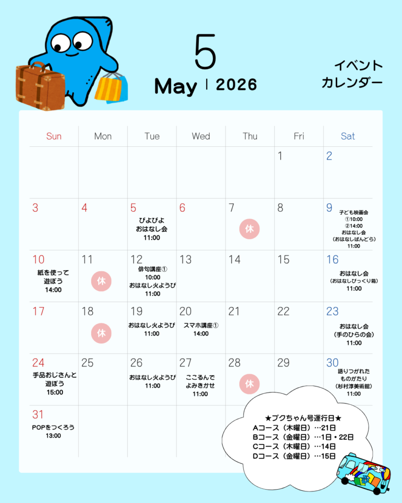 2026年04月28日 市民図書館 【市民図書館】5月のイベント情報 市民図書館5月のイベントカレンダーです♪ 5月に申し込みが必要なイベントは、 5月12日(水)10:00~俳句講座 5月20日(水)14:00~スマホ講座です。 その他のイベントは申込不要ですので、直接会場までお越しください。 ボランティアさんによるおはなし会やPOPづくりのイベントもあります!