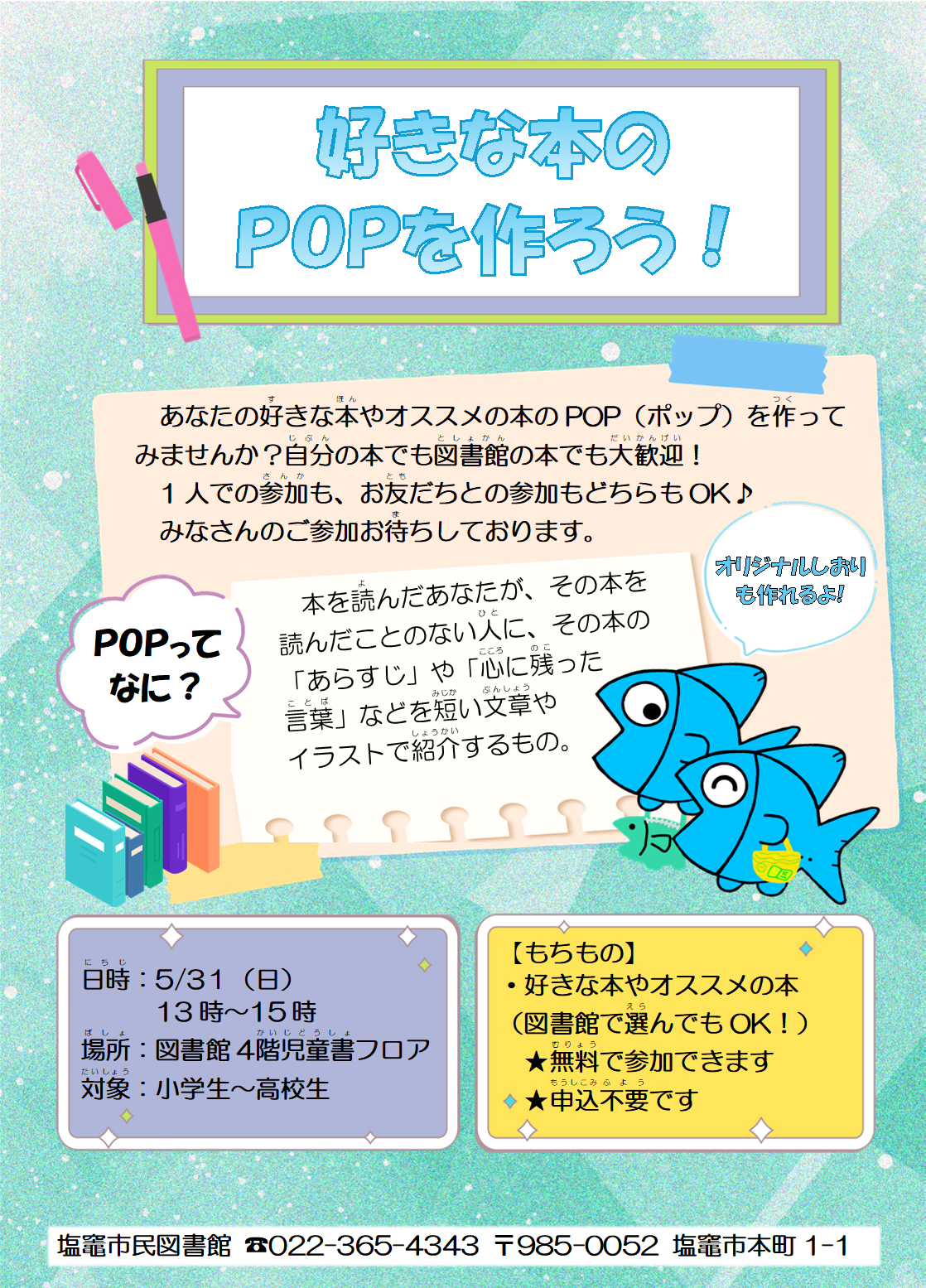 2026年04月25日 市民図書館 好きな本のPOPを作ろう! あなたの好きな本やオススメの本のPOP(ポップ)を作ってみませんか? 自分の本でも図書館の本でも大歓迎! 1人での参加も、お友だちとの参加もどちらもOK♪ オリジナルしおりも当日作れますよ♪ みなさんのご参加お待ちしております。 日時:5/31(日) 13時~15時 場所:図書館4階 児童書フロア 対象:小学生~高校生 もちもの:POPで紹介する本(図書館で選んでもOK!) ☆自分で使いたいものがあればご持参ください ※紙と筆記用具は図書館でも準備しています ※申込不要・無料です