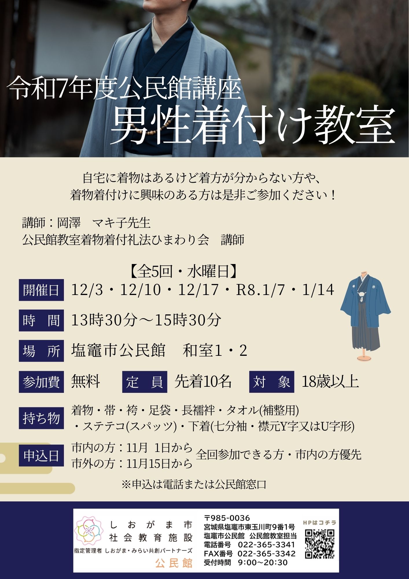 2025年10月30日 公民館 令和7年度公民館講座『男性着付け教室』を開催します 今年も【男性着付け教室】を開催します! 場所:塩竈市公民館2階 和室1.2 時間:13:30~15:00 対象:18歳以上の男性 参加費:無料 定員:各回先着10名 定員になり次第、受付終了とさせて頂きます。 申込方法:公民館の窓口か電話 持ち物:着物・袴・タオル(補整用) ステテコ(スパッツ)・ 下着(七分袖・襟元Y字又はU字形) TEL 022-365-3341(受付時間9:00~20:30)