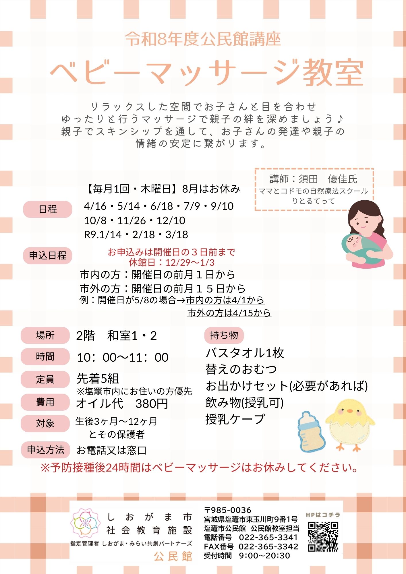 令和8年4月から「ベビーマッサージ教室」を開催しています。