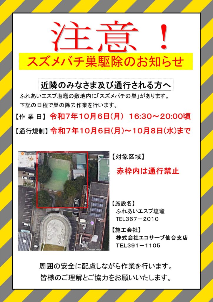 2025年10月04日 ふれあいエスプ塩竈 ハチの巣駆除と、周辺設備休止のお知らせ ふれあいエスプ塩竈のツリーハウス上の「スズメバチの巣」の撤去を行います。 以下の期間中、敷地の外設備と、それらに隣する通路がご利用できません。 【作 業 日】 令和7年10月6日(月) 16:30~20:00頃 【通行規制】 令和7年10月6日(月)~10月8日(水)まで 周囲の安全に配慮しながら作業を行うため、日程が変更となる場合があります。。 皆様のご理解とご協力をお願いいたします。
