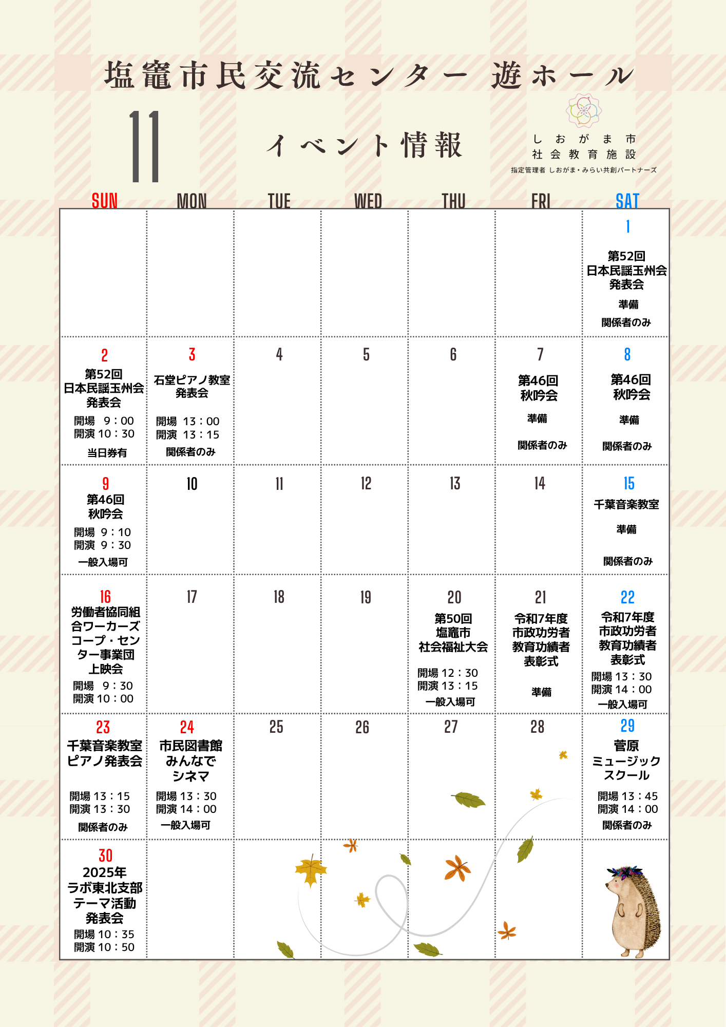 2025年10月28日 遊ホール 【遊ホール】11月イベント情報 塩竈市民交流センター・遊ホールの11月分の行事予定表のお知らせです。 皆さまのご来館を心よりお待ちしております! お問合わせ先【塩竈市民交流センター・遊ホール TEL 022-365-5000/受付時間 9時~20時】