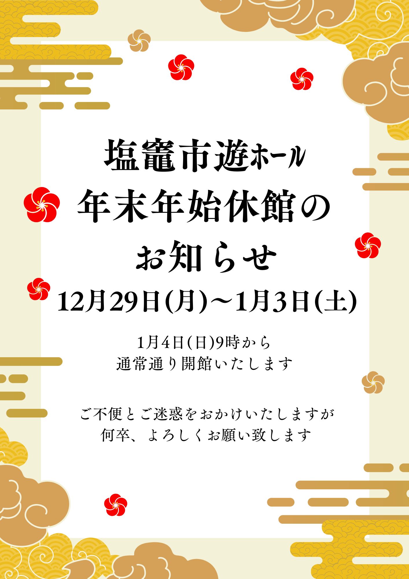 2025年12月03日 遊ホール 【遊ホール】年末年始休館のおしらせ 日頃より遊ホールをご利用いただきありがとうございます。 年末年始は12月29日(月)~1月3日(土)を休館日とさせていただきます。 1月4日(日)は9時から通常通り開館いたします。 ご不便とご迷惑をおかけいたしますが何卒よろしくお願い申し上げます。 お問合わせ先【塩竈市民交流センター・遊ホール TEL 022-365-5000/受付時間 9時~20時】