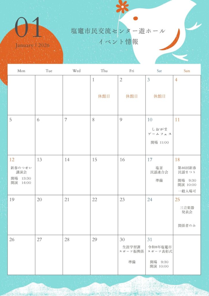 2026年01月20日 遊ホール 【遊ホール】1月イベント情報 塩竈市民交流センター・遊ホールの1月分の行事予定表のお知らせです。 皆さまのご来館を心よりお待ちしております! お問合わせ先【塩竈市民交流センター・遊ホール TEL 022-365-5000/受付時間 9時~20時】