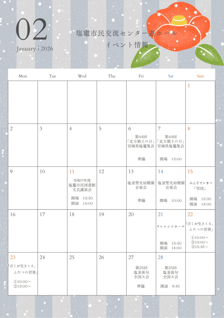 2026年02月01日 遊ホール 【遊ホール】2月イベント情報 塩竈市民交流センター・遊ホールの2月分の行事予定表のお知らせです。 皆さまのご来館を心よりお待ちしております! お問合わせ先【塩竈市民交流センター・遊ホール TEL 022-365-5000/受付時間 9時~20時】