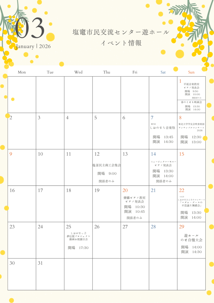 2026年03月03日 遊ホール 【遊ホール】3月イベント情報 塩竈市民交流センター・遊ホールの3月分の行事予定表のお知らせです。 皆さまのご来館を心よりお待ちしております! お問合わせ先【塩竈市民交流センター・遊ホール TEL 022-365-5000/受付時間 9時~20時】