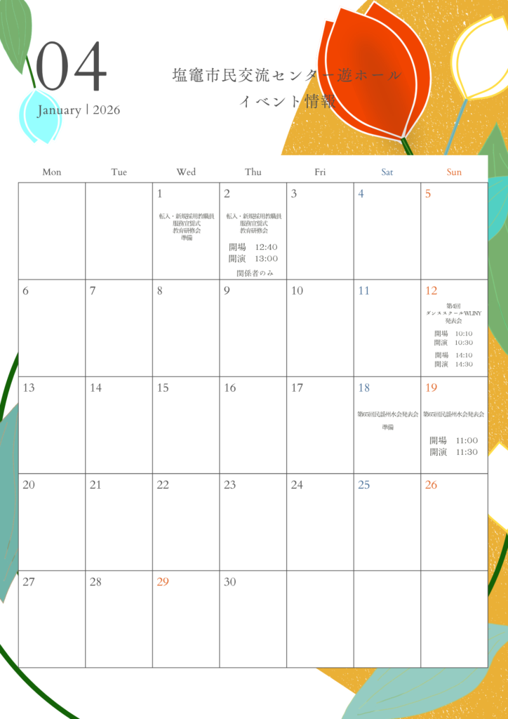 2026年03月31日 遊ホール 【遊ホール】4月イベント情報 塩竈市民交流センター・遊ホールの4月分の行事予定表のお知らせです。 皆さまのご来館を心よりお待ちしております! お問合わせ先【塩竈市民交流センター・遊ホール TEL 022-365-5000/受付時間 9時~20時】