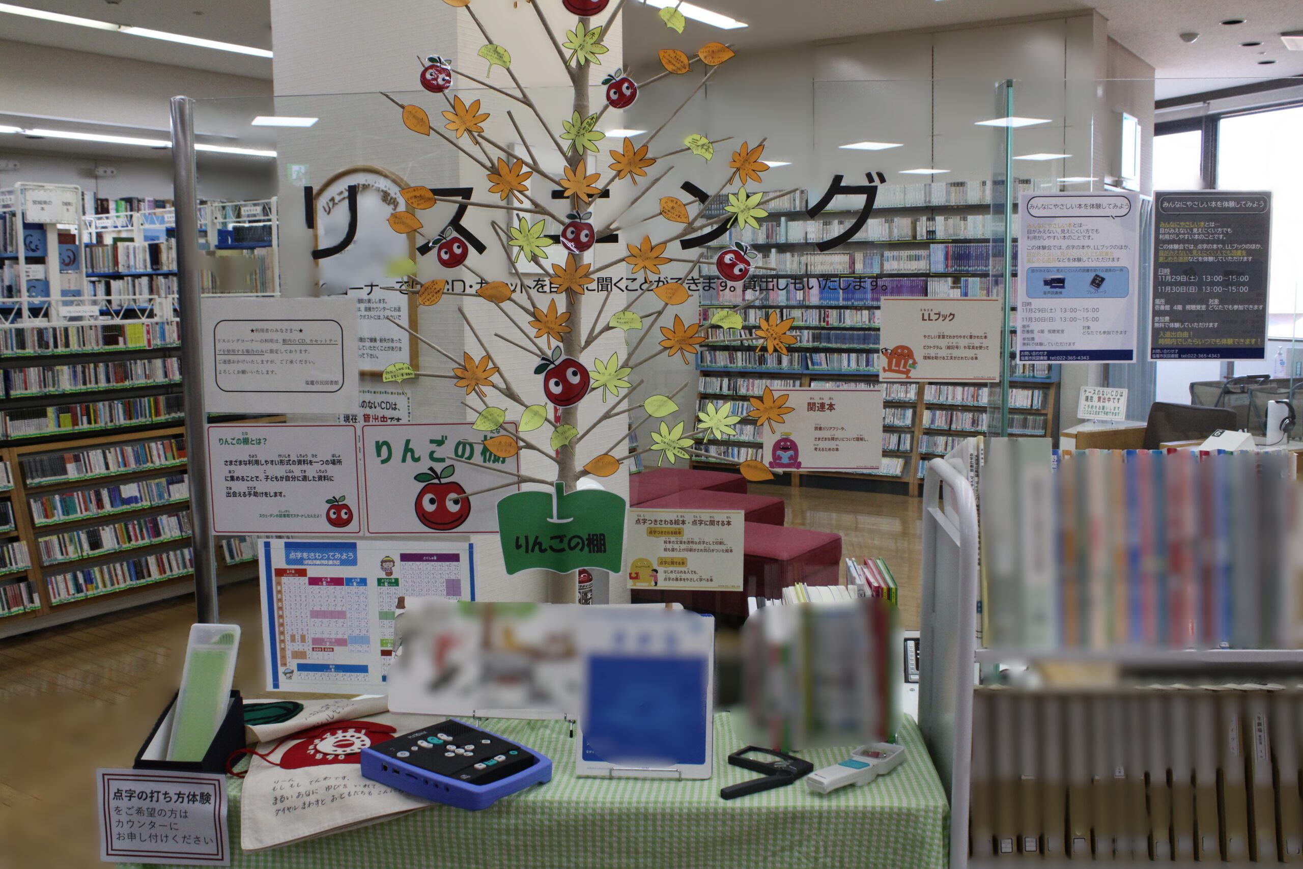 2025年11月27日 市民図書館 りんごの棚 【りんごの棚🍎】 3階にりんごの棚を設置しました 点字つきの本、さわる絵本など さまざまな利用しやすい形式の資料と 読書の手助けとなる道具を展示しています 実際にふれて体験をしてください 展示期間 11/28(金)~12/22(月)