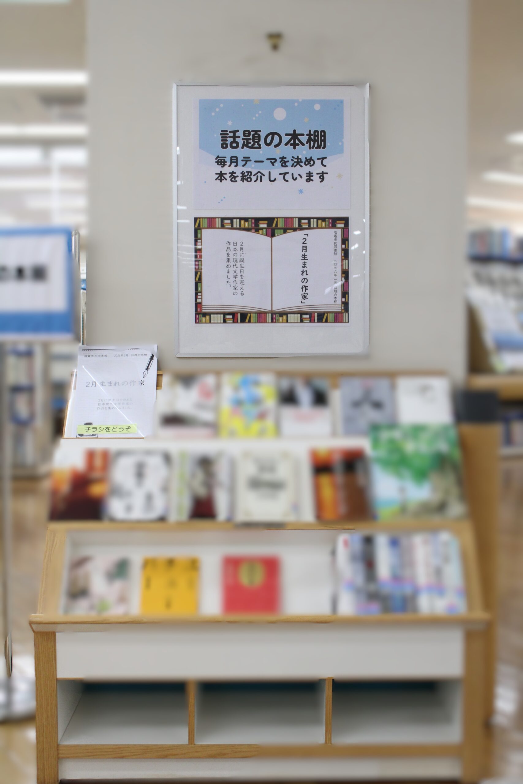 2026年01月29日 市民図書館 3階 2月のテーマ展示 3階の2月の展示を ご紹介します! 展示期間:1/30~2/25 話題の本棚 【2月生まれの作家】 2月に誕生日を迎える日本現代文学作家の作品を集めてみました。 健康医療情報コーナー 【全国生活習慣病予防月間】 毎年2月は全国生活習慣病予防月間です。 スローガン「幸せは足元から 多く動いて健康を実感」 ビジネス支援コーナー 【投資ってなんだろう?】 投資や株式などの資産運用に関する本を集めました。